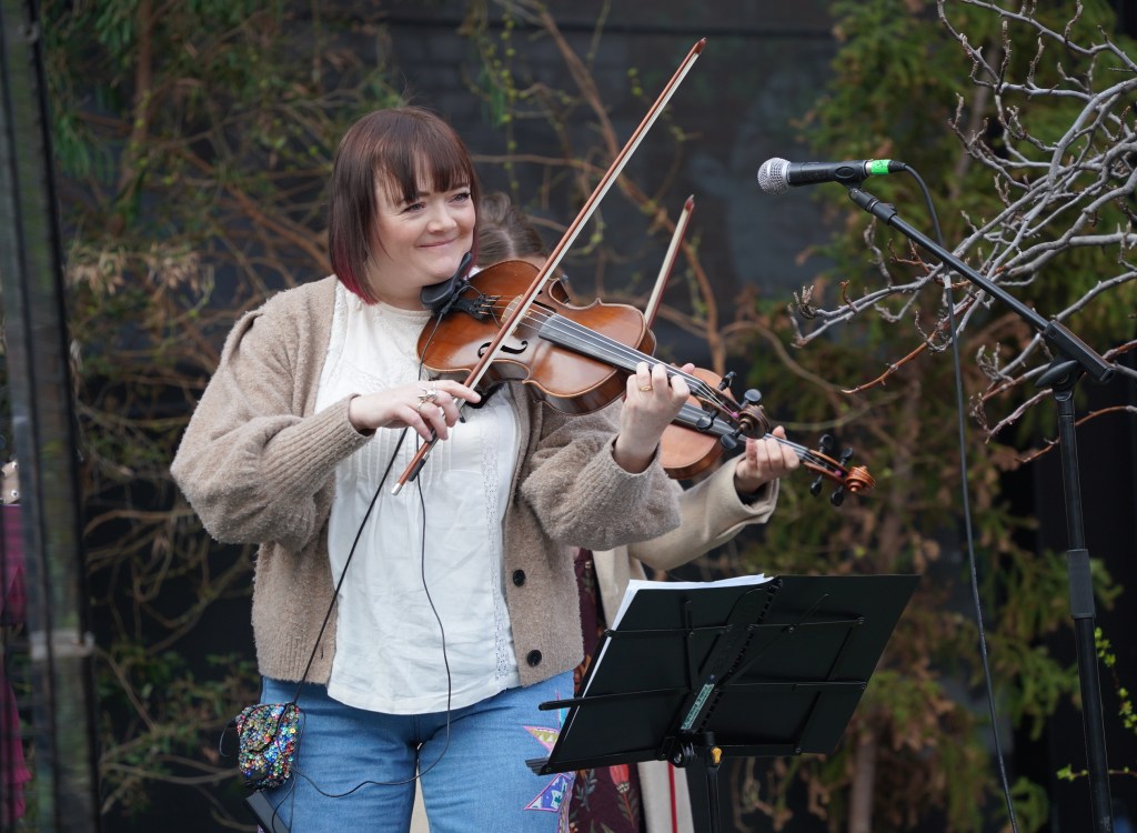 On a gorgeous Sunday in May, 2022, the Tasmanian Heritage Fiddle Ensemble played from a covered stage to the audience, relaxing, eating and drinking deliciousness, out on the spacious lawns at MONA. The THFE played traditional Tasmanian tunes, such as Eileen McCoy’s Varsoviennas, Gran McCoy’s and Leo Prince of Wales Schottische as well as a selection of favourite tunes collected from the Cape Barren Islanders. Contemporary tunes written by past or present members of the group, such as Delayed Flight, One Way Ticket, Raw Rosin, Short Shrift and Forks in the Fire had people at least dancing on the inside, if they weren’t dancing on the lawns! For a different flavour, Ross Smithard’s original Dingo’s Breakfast set had toes tapping to an Old Timey flavour. Later in the afternoon, the clouds began to look threatening. When heavy rain suddenly pelted down on umbrellas, bean bags and the cute three legged white stools, the audience scattered, but quick thinking saved the day as Musical Director, Emily Wolfe, invited the audience in. To everyone’s delight, Emily turned the band around to face the audience, thus saving much reorganising of the sound gear! It was, from then on, a cosy indoor concert as the enthusiastic audience dried off and steady rain continued to soak the abandoned lawns…
